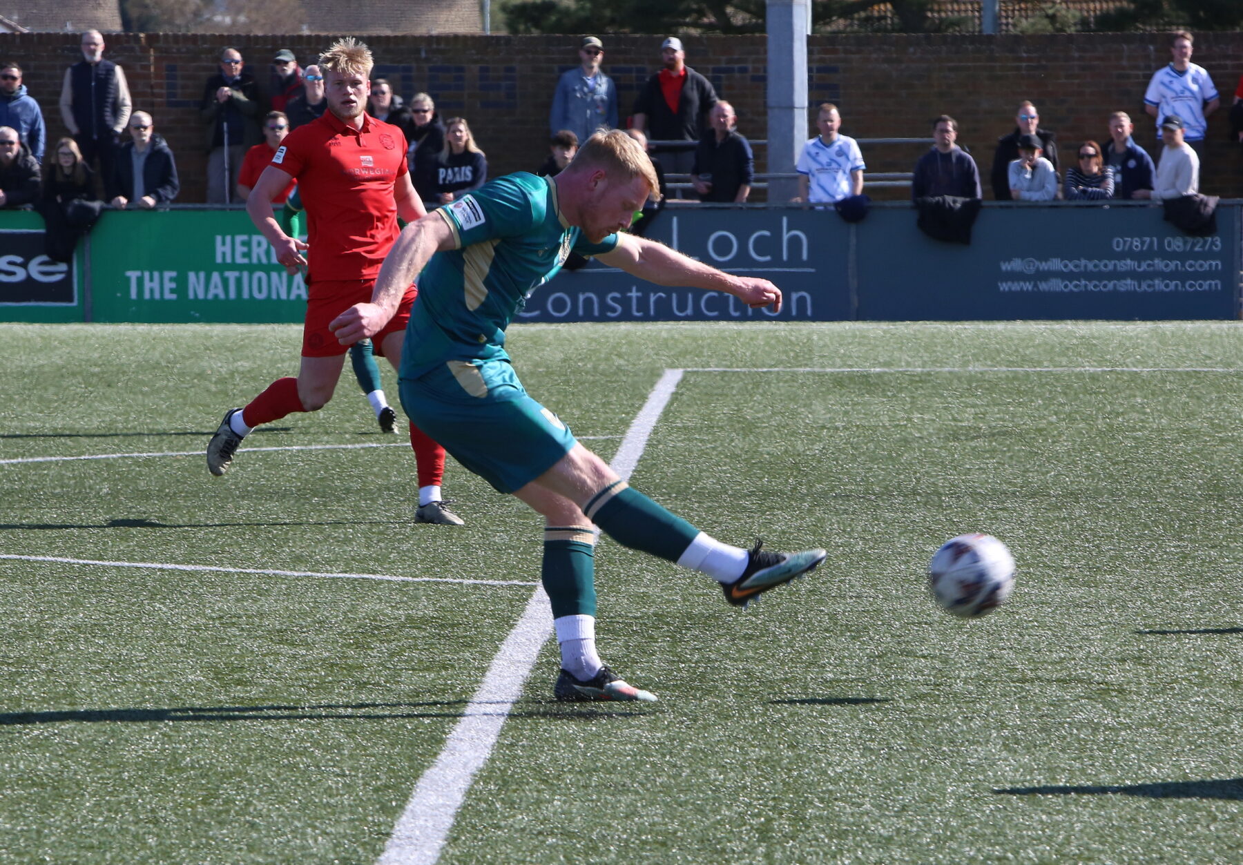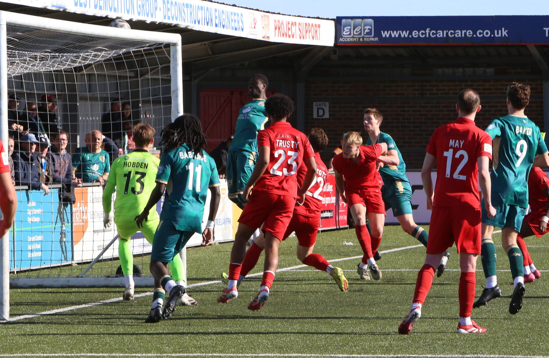 Matty Warren was next to test the keeper with a fierce shot that Hobden was equal to. Despite Tonbridge’s dominance, Eastbourne Borough remained a threat on the counter with Skieters proving a constant threat all game. Skieters again tested Rowley in the 25th minute with a fierce shot before Freddie Carter headed over the crossbar from the resulting corner.