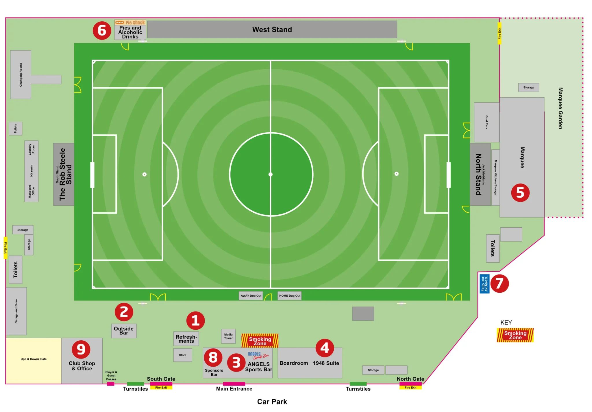 1. Tea Hut 2. Outside Bar 3. Angels Sports Bar 4. 1948 Suite 5. Marquee 6. Pie Shack 7. Fries Like an Angel 8. Sponsors Bar 9. Club Shop / Office